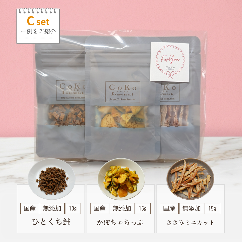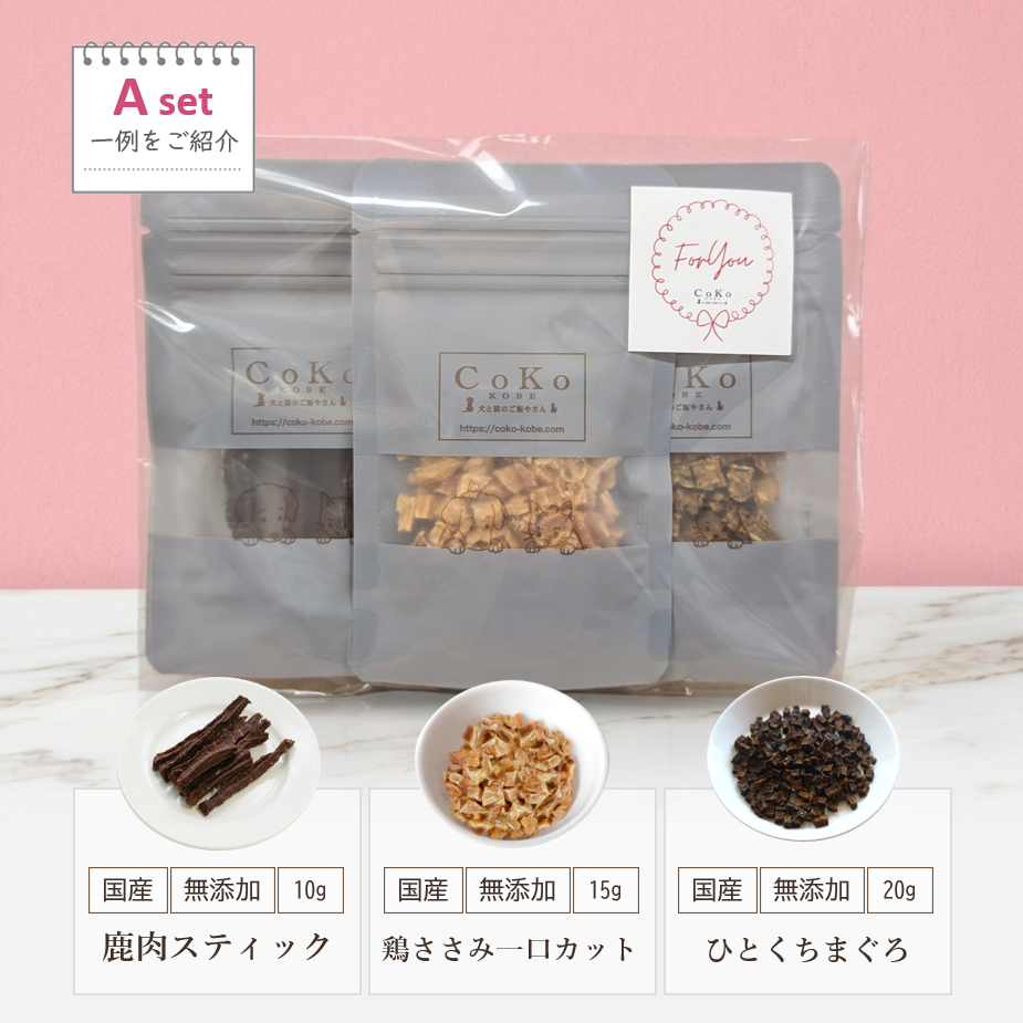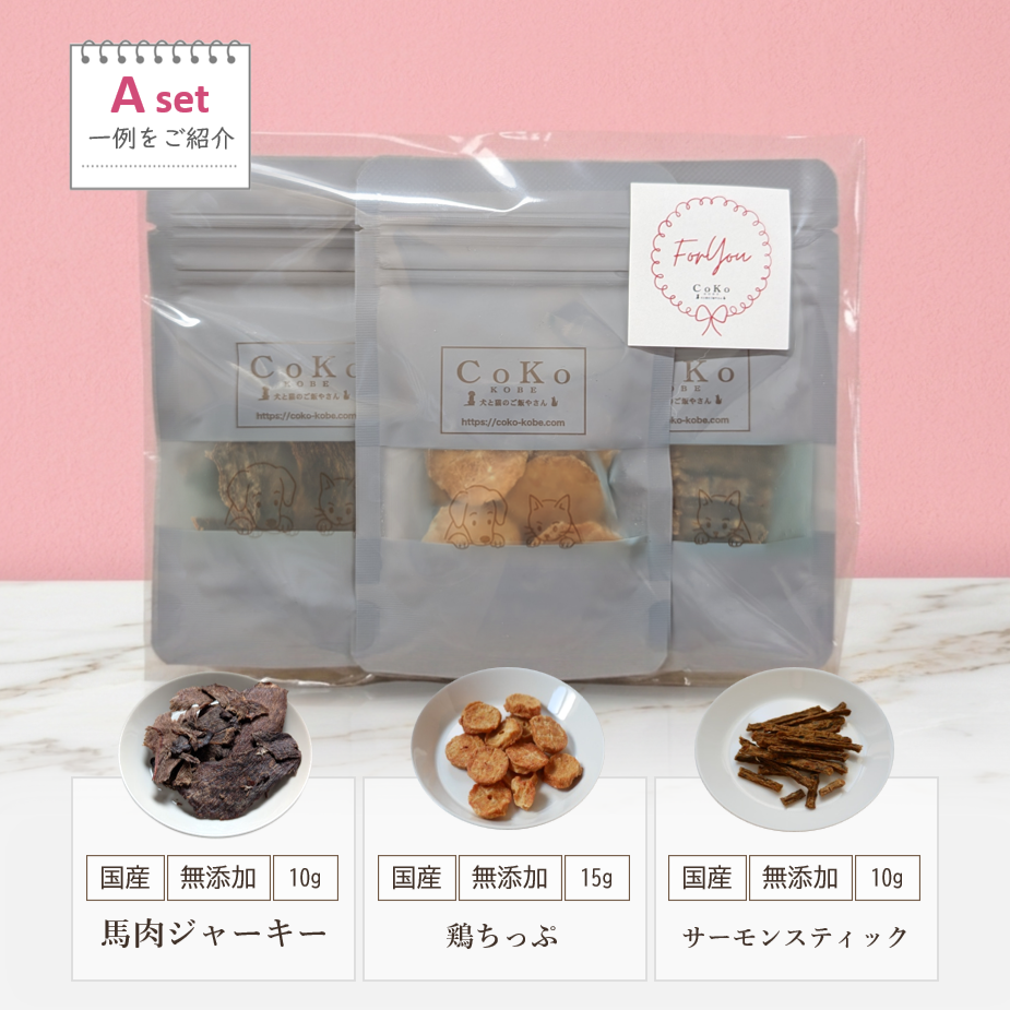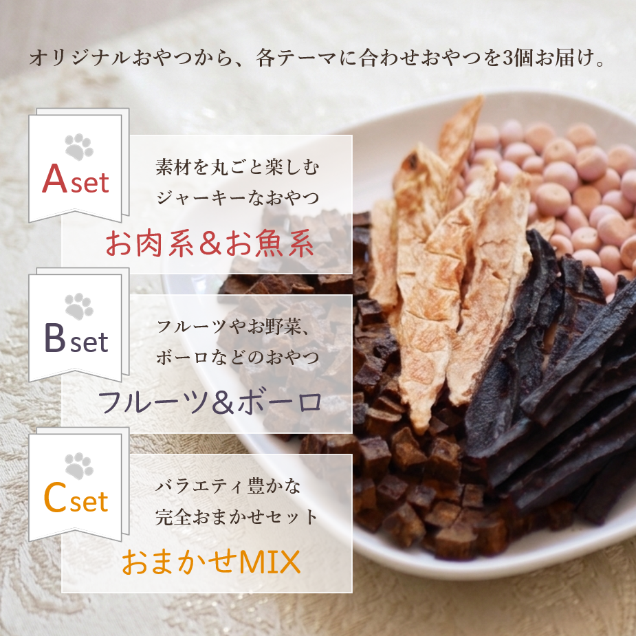 | 商品について | 【Aセット・お魚&お肉系】【Bセット・フルーツ&ボーロ】【Cセット・おまかせミックス】の中から、お好きなセットをお選びください。各テーマに合わせてお届けいたしますが、おやつの種類は選べません。 |