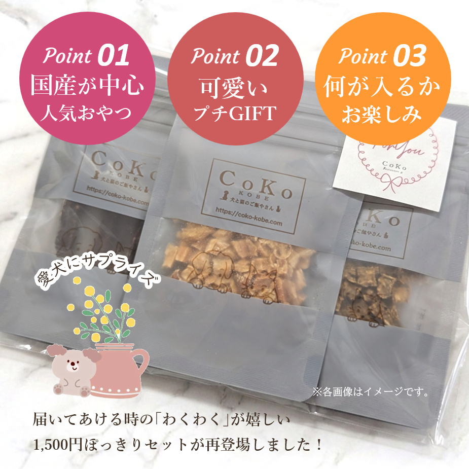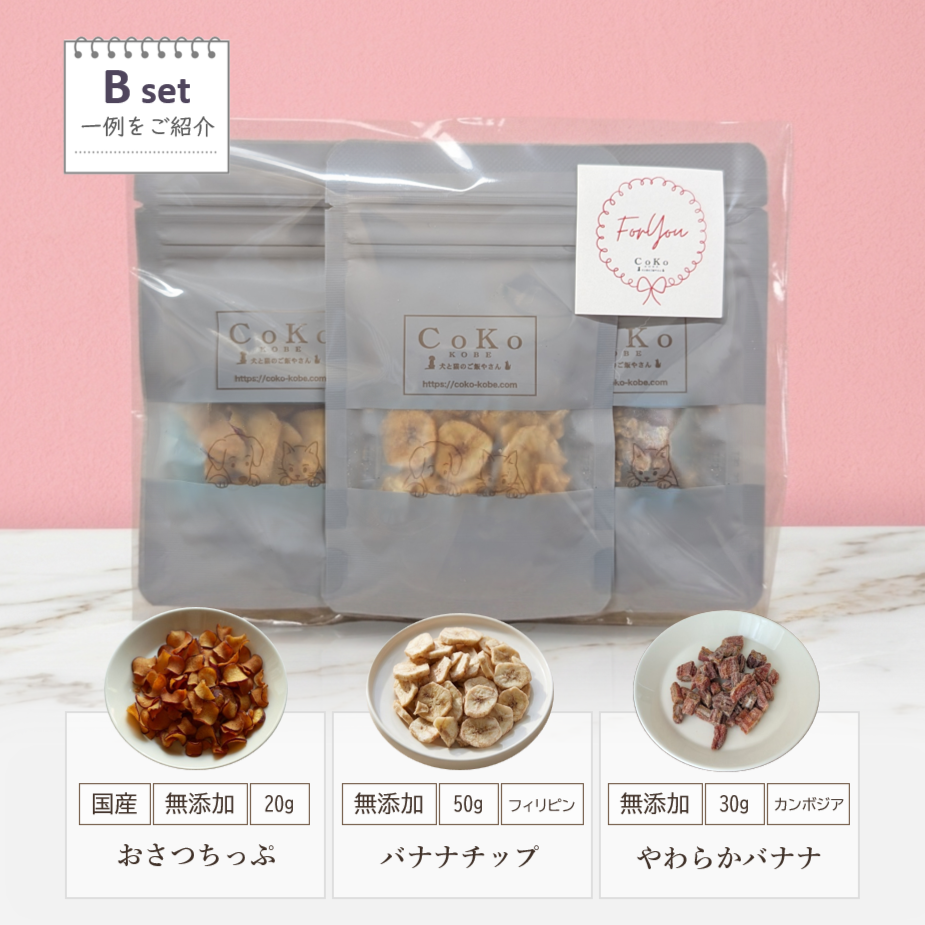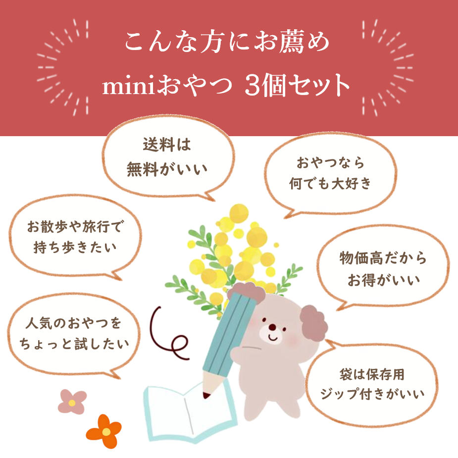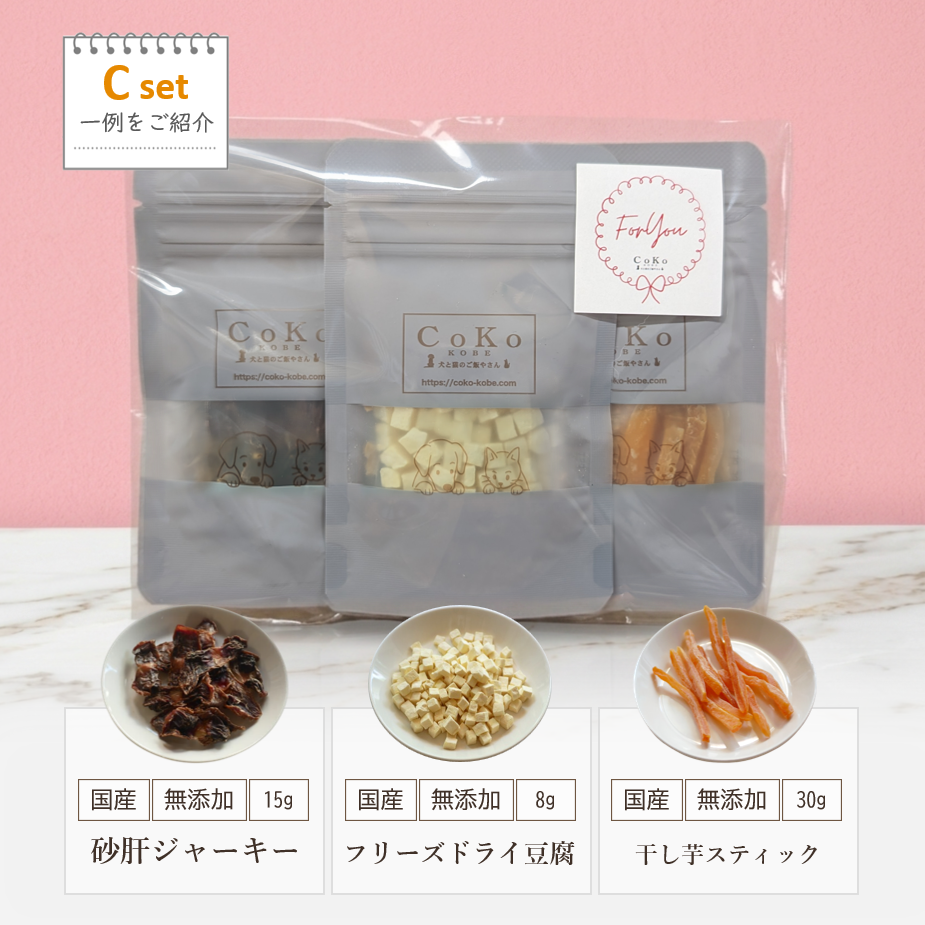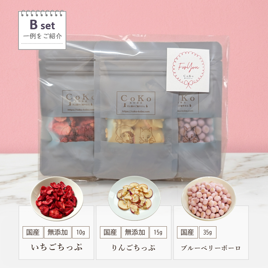 | 商品について | 【Aセット・お魚&お肉系】【Bセット・フルーツ&ボーロ】【Cセット・おまかせミックス】の中から、お好きなセットをお選びください。各テーマに合わせてお届けいたしますが、おやつの種類は選べません。 |