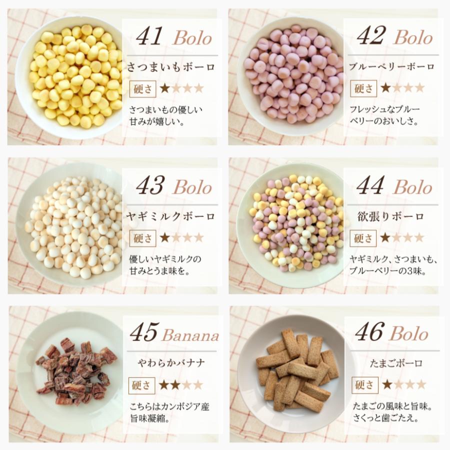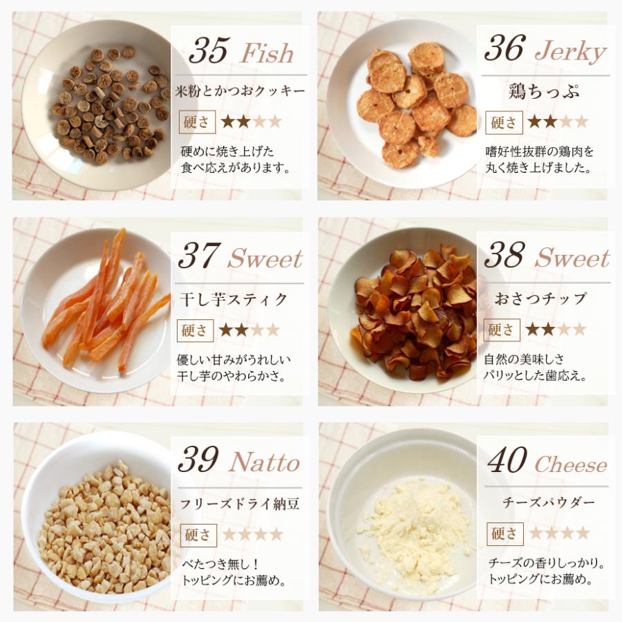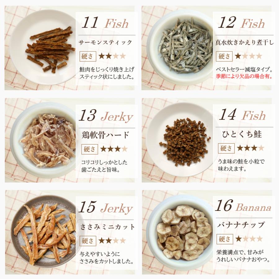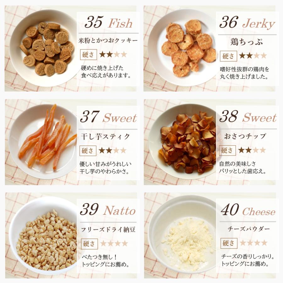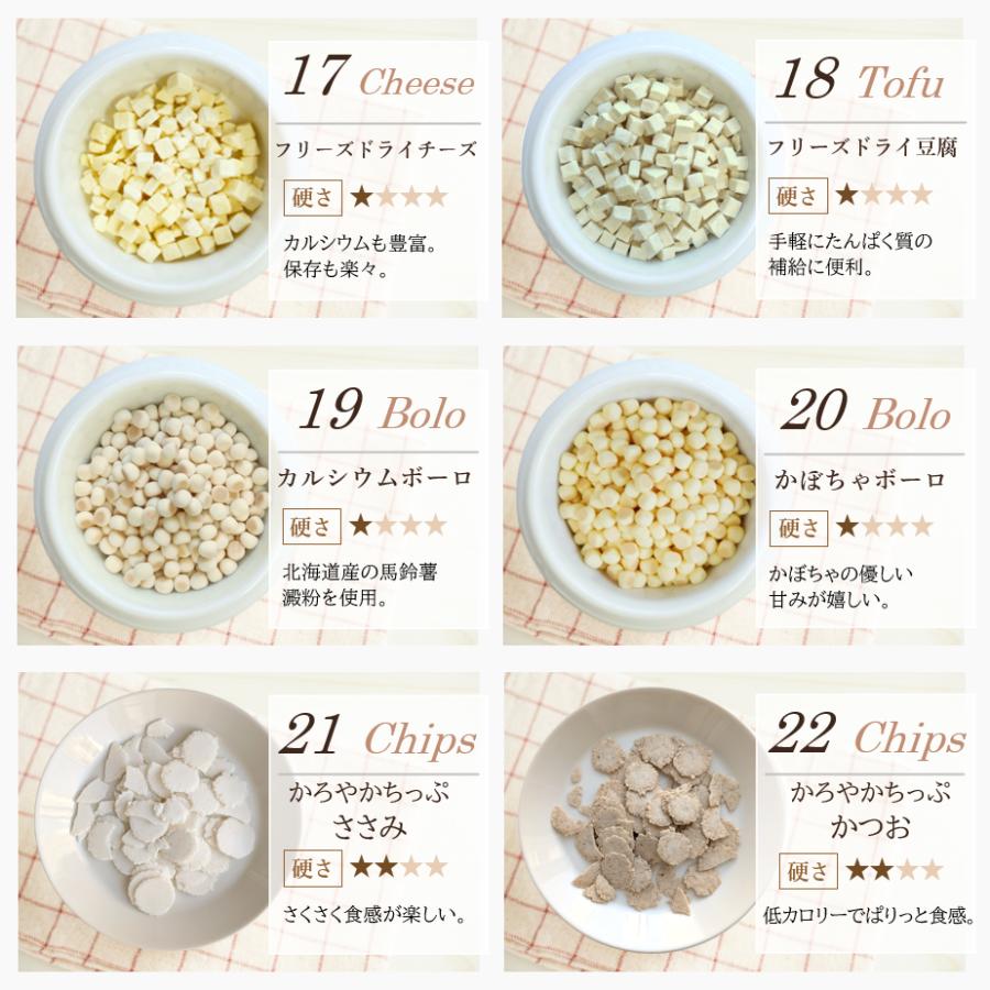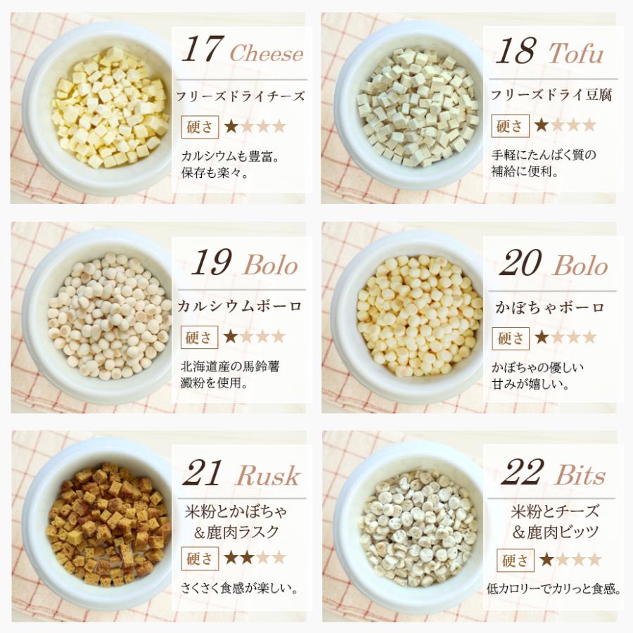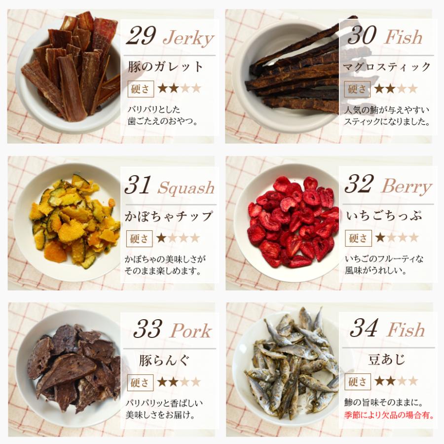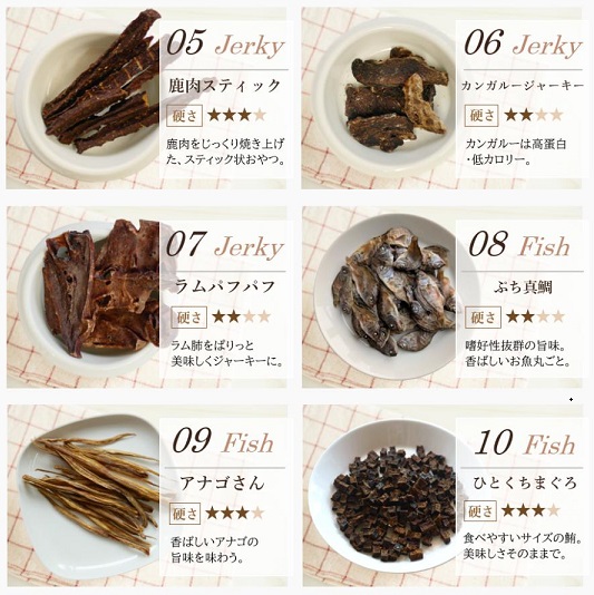 | 原材料 | 肉のおやつ ■馬肉ジャーキー★10g ・原材料 馬肉 ・粗蛋白質 68%以上・粗脂肪 8.0%以上・粗繊維 0.1%以下・粗灰分 6.4%以下・水分 15%以下・カロリー 約320kcal/100g ■地鶏スティック★10g ・原材料 鶏肉 ・粗蛋白質 87.3%以上・粗脂肪 3.4%以上・粗繊維質 0.1%以下・粗灰分 4.3%以下・水分 10%以下・カロリー 約292kcal/100g ■鶏軟骨ハード★10g ・原材料 鶏軟骨 ・粗蛋白質 61%以上・粗脂肪 3.5%以上・粗繊維質 1.0%以下・粗灰分 3.0%以下・水分 15%以下・カロリー 約305kcal/100g ■鶏ささみ一口カット★15g ・原材料 鶏ささみ ・粗蛋白質 73%以上・粗脂肪 2.0%以上・粗繊維質 0.5%以下・粗灰分 6.0%以下・水分 13%以下・カロリー 約302kcal/100g ■鹿肉スティック★10g ・原材料 鹿肉 ・粗蛋白質 69%以上・粗脂肪 4.3%以上・粗繊維質 2.0%以下・粗灰分 3.0%以下・水分 10%以下・カロリー 304kcal/100g ■カンガルージャーキー★10g ・原材料 カンガルー ・粗蛋白質 79.4g・脂質 3g・炭水化物 0.7g・灰分 4.4g・水分 12.5g・ナトリウム 170mg・カロリー 約322kcal/100gあたり ■ラムパフパフ★10g ・原材料 羊肺 ・粗蛋白質 71.2g・粗脂質 7.7g・炭水化物 3.9g・水分 11.5g・灰分 5.7g・ナトリウム 710mg・カロリー 347kcal/100g ■鶏むね肉薄切り★20g ・原材料 鶏胸肉 ・粗蛋白質 75%以上・粗脂肪 5.0%以上・粗繊維 0.9%以下・粗灰分 4.0%以下・水分 14.7%以下・カロリー 約358kcal/100g ■ささみミニカット★15g ・原材料 鶏ささみ ・粗蛋白質 80%以上・粗脂肪 2.0%以上・粗繊維 0.5%以下・粗灰分 5.0%以下・水分 10%以下・カロリー 350kcal/100g ■神戸ポーク豚ハツ★15g ・原材料 豚心臓 ・粗蛋白質 67%以上・粗脂肪 3.8%以上・粗炭水化物 0.1%以下・粗灰分 7.5%以下・水分 11%以下・カロリー 304kcal/100g ■鶏砂肝ジャーキー★15g ・原材料 鶏砂肝 ・粗蛋白質 55%以上・粗脂肪 5.0%以上・粗繊維 0.5%以下・粗灰分 7.0%以下・水分 10%以下・カロリー 259kcal/100g ■豚ガレット★15g ・原材料 豚食道 ・粗蛋白質 66%以上・粗脂肪 7.0%以上・粗繊維 7.0%以下・粗灰分 3.8%以下・水分 10%以下・カロリー 332kcal/100g ■豚らんぐ★15g ・原材料 豚肺 ・粗蛋白質 74%以上・粗脂肪 10%以上・粗繊維 2.0%以下・粗灰分 10%以下・水分 12%以下・カロリー 304kcal/100g ■鶏ちっぷ★15g ・原材料 鶏肉 ・粗蛋白質 80%以上・粗脂肪 2.0%以上・粗繊維 0.5%以下・粗灰分 5.0%以下・水分 10%以下・カロリー 350kcal/100g 魚のおやつ ■アナゴさん★15g ・原材料 穴子(ベトナム産) ・粗蛋白質 72%以上・粗脂肪 0.8%以上・粗繊維質 0.1%以下・粗灰分 6.0%以下・水分 12%以下・カロリー 約327kcal/100g ■ひとくちまぐろ★20g ・原材料 鮪 ・粗蛋白質 80%以上・粗脂肪 1.0%以上・粗繊維質 0.5%以下・粗灰分 5.0%以下・水分 10%以下・カロリー 約350kcal/100g ■サーモンスティック★10g ・原材料 鮭 ・粗蛋白質53%以上・粗脂肪6.0%以上・粗繊維質0.1%以下・粗灰分3.0%以下・水分10%以下・カロリー 約366kcal/100g ■真水炊きかえり煮干し★20g ・原材料 片口鰯 ・粗蛋白質 70%以上・粗脂肪 5.0%以上・粗繊維質 0.1%以下・粗灰分 12%以下・水分 12%以下・カロリー 約295kcal/100g ■ひとくち鮭★10g ・原材料 鮭 ・粗蛋白質 71%以上・粗脂肪 12%以上・粗繊維質 0.1%以下・粗灰分 4.5%以下・水分 10%以下・カロリー 約368kcal/100g ■マグロスティック★15g ・原材料 鮪 ・粗蛋白質 80%以上・粗脂肪 1.0%以上・粗繊維質 0.5%以下・粗灰分 5.0%以下・水分 10%以下・カロリー 約350kcal/100gあたり ■豆あじ★20g ・原材料 鯵 ・粗蛋白質 25%以上・粗脂肪 3.0%以上・粗繊維質 4.5%以下・粗灰分 5.5%以下・水分 14%以下・カロリー 約295kcal/100g ■米粉とかつおのクッキー★15g ・原材料 米粉・馬鈴薯澱粉・鰹節 ・粗蛋白質 7.2%以上・粗脂肪 2.5%以上・粗繊維質 0.8%以下・粗灰分 0.8%以下・水分 9.0%以下・カロリー 約325kcal/100g その他のおやつ ■バナナチップ★50g ・原材料 バナナ・砂糖・ココナッツ油 ・粗蛋白質 10%以上・粗脂肪 33.3%以上・粗繊維 3.5%以下・粗灰分 2.7%以下・水分 4.0%以下・カロリー 533kcal/100g ■フリーズドライチーズ★10g ・原材料 ナチュラルチーズ(一部に乳成分を含む) ・粗蛋白質 40.8%以上・粗脂肪 48.6%以上・粗炭水化物 4.0%・食塩相当量 2.8%・カロリー 617kcal/100g ■フリーズドライ豆腐★8g ・原材料 豆腐、トレハロース、豆腐用凝固剤、酸化防止剤(ビタミンE) ・粗蛋白質 27%・粗脂肪 17.9%・粗灰分 4.6%・粗炭水化物 45.5%・ナトリウム 0.32%・水分5.0%・カロリー 452kcal/100g ■カルシウムボーロミニ★40g ・原材料 馬鈴薯澱粉粉、砂糖、液全卵、ぶどう糖、水飴、脱脂粉乳、寒梅粉MIX(とうもろこし澱粉粉、もち米)、殺菌乳酸菌粉末、卵殻カルシウム ・粗蛋白質 1.5%以上・粗脂肪 3.6%以上・粗灰分 0.9%以下・粗繊維 0.0%以下・水分 5.9%以下・カルシウム 320mg・カロリー 381kcal/100g ■かぼちゃボーロ★40g ・原材料 馬鈴薯澱粉、砂糖、水飴、液卵黄(卵を含む)南瓜粉末、牛乳/卵殻カルシウム ・粗蛋白質 1.6%以上・粗脂肪 1.8%以上・粗灰分 1.3%以下・粗繊維 0.1%以下・水分 4.4%以下・カルシウム 425mg・カロリー 391kcal/100g ■米粉かぼちゃ&鹿肉ラスク★15g ・原材料 米粉、馬鈴薯