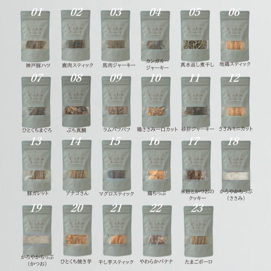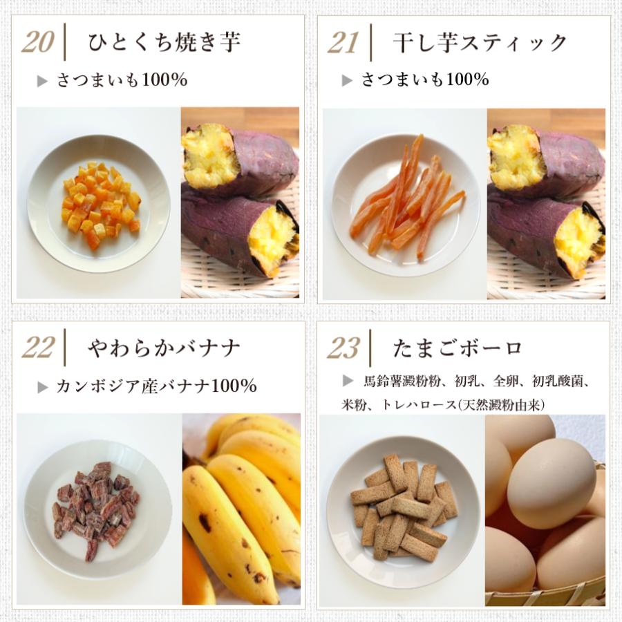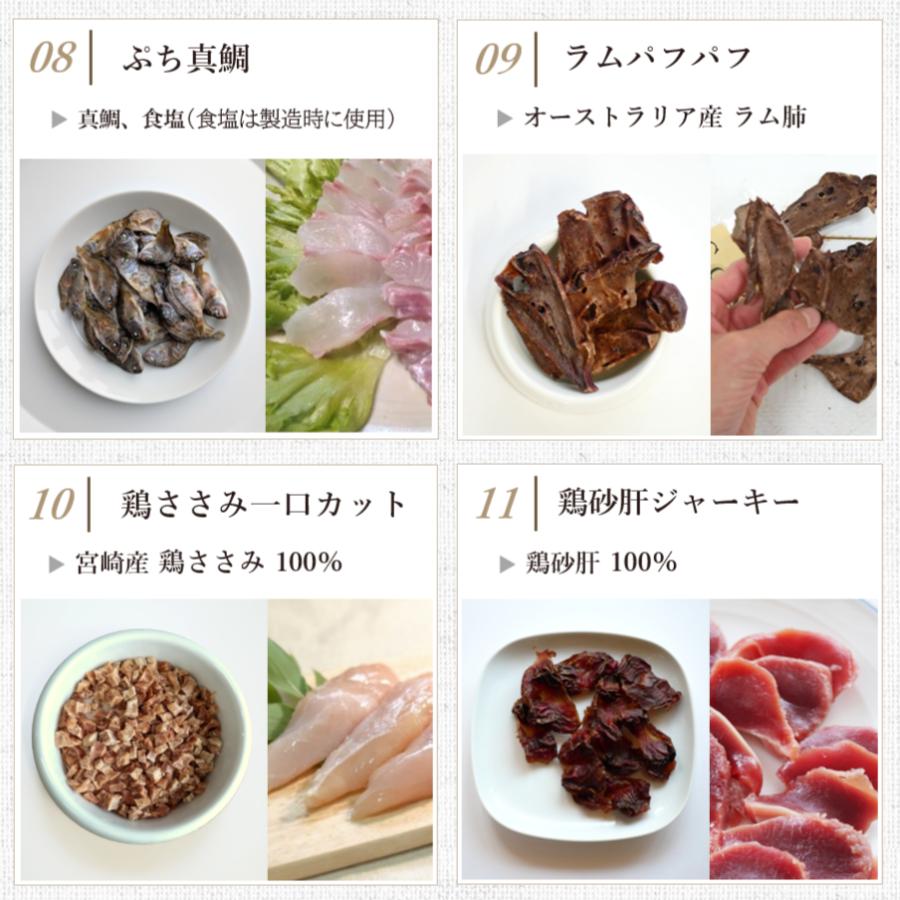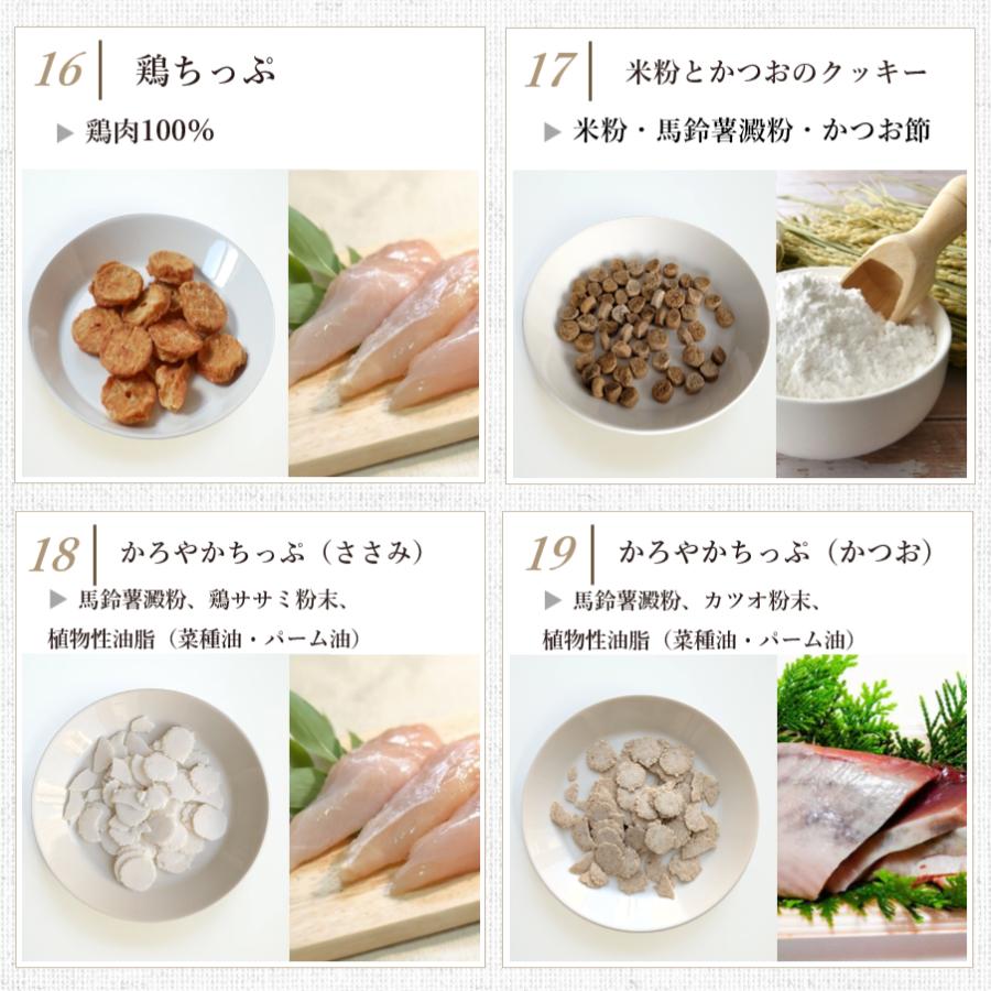 | 各原材料他 | 【1】神戸ポーク 豚ハツ★50g ・原材料 豚肉(神戸ポーク 心臓) ・粗たんぱく質 67.0%以上・粗脂肪 3.8%以上 ・粗繊維質 0.1%以下・粗灰分 7.5%以下 ・水分 11.0%以下・カロリー 約304kcal/100g 【2】鹿肉スティック★40g ・原材料 鹿肉 ・粗たんぱく質 69.0%以上・粗脂肪 4.3%以上 ・粗繊維質 2.0%以下・粗灰分 3.0%以下 ・水分 10.0%以下・カロリー 304kcal/100g 【3】馬肉ジャーキー★40g ・原材料 馬肉 ・粗たんぱく質 68.0%以上・粗脂肪 8.0%以上 ・粗繊維 0.1%以下・粗灰分 6.4%以下 ・水分 15.0%以下・カロリー 約320kcal/100g 【4】カンガルージャーキー★35g ・原材料 カンガルー ・粗たんぱく質 79.4g・脂質 3g ・炭水化物 0.7g・灰分 4.4g・水分 12.5g ・ナトリウム 170mg・カロリー 約322kcal/100gあたり 【5】真水炊きかえり煮干し★70g ・原材料 片口いわし ・粗たんぱく質 70.0%以上・粗脂肪 5.0%以上 ・粗繊維質 0.1%以下・粗灰分 12.0%以下 ・水分 … 12.0%以下・カロリー … 約295kcal/100g 【6】地鶏スティック★30g ・原材料 鶏肉 ・粗たんぱく質 87.3%以上・粗脂肪 3.4%以上 ・粗繊維質 0.1%以下・粗灰分 4.3%以下 ・水分 10.0%以下・カロリー 約292kcal/100g 【7】ひとくちまぐろ★55g ・原材料 鮪 ・粗たんぱく質 80.0%以上・粗脂肪 1.0%以上 ・粗繊維質 0.5%以下・粗灰分 5.0%以下 ・水分 10.0%以下・カロリー 約350kcal/100g 【8】ぷち真鯛★50g ・原材料 真鯛、食塩(食塩は製造時に使用) ・粗蛋白質 58.0%以上・粗脂肪 2.0 %以上 ・粗繊維 1.0%以下・粗灰分 17.0%以下 ・水分 17.0%以下・カロリー 238kcal/100g 【9】ラムパフパフ★35g ・原材料 ラム肺 ・粗たんぱく質 71.2g・粗脂質 7.7g・炭水化物 3.9g ・水分 11.5g・灰分 5.7g・ナトリウム 710mg ・カロリー 347kcal/100g 【10】鶏ささみ一口カット★40g ・原材料 鶏ささみ ・粗たんぱく質 73.0%以上・粗脂肪 2.0%以上 ・粗繊維質 0.5%以下・粗灰分 6.0%以下 ・水分 13.0%以下・カロリー 約302kcal/100g 【11】鶏砂肝ジャーキー★55g ・原材料 鶏砂肝(すなぎも) ・粗たんぱく質 55.0%以上・粗脂肪 5.0%以上 ・粗繊維 0.5%以下・粗灰分 7.0%以下 ・水分 10.0%以下・カロリー 259kcal/100g 【12】ささみミニカット★50g ・原材料 鶏のささみ ・粗たんぱく質 80.0%以上・粗脂肪 2.0%以上 ・粗繊維質 0.5%以下・粗灰分 5.0%以下 ・水分 … 10.0%以下・カロリー … 約350kcal/100g 【13】豚ガレット★45g ・原材料 豚食道(兵庫県) ・粗たんぱく質 66.0%以上・粗脂肪 7.0%以上 ・粗繊維質 7.0%以下・粗灰分 3.8%以下 ・水分 … 10.0%以下・カロリー … 約332kcal/100g 【14】アナゴさん★45g ・原材料 アナゴ(ベトナム産) ・粗たんぱく質 72.0%以上・粗脂肪 0.8%以上 ・粗繊維質 0.1%以下・粗灰分 6.0%以下 ・水分 12.0%以下・カロリー 約327kcal/100g 【15】マグロスティック★50g ・原材料 マグロ ・粗たんぱく質 80.0%以上・粗脂肪 1.0%以上 ・粗繊維質 0.5%以下・粗灰分 5.0%以下 ・水分 10.0%以下・カロリー 約350kcal/100gあたり 【16】鶏ちっぷ★50g ・原材料 鶏肉 ・粗蛋白質 80%以上・粗脂肪 2.0%以上 ・粗繊維 0.5%以下・粗灰分 5.0%以下 ・水分 10%以下・カロリー 350kcal/100g 【17】米粉とかつおのクッキー★40g ・原材料 米粉・馬鈴薯澱粉・鰹節 ・粗蛋白質 7.2%以上・粗脂肪 2.5%以上 ・粗繊維質 0.8%以下・粗灰分 0.8%以下 ・水分 9.0%以下・カロリー 約325kcal/100g 【18】かろやかちっぷ(ささみ)★60g ・原材料 馬鈴薯澱粉、鶏ササミ粉末、植物性油脂(菜種油・パーム油) ・粗蛋白質 5.0%以上・粗脂肪 1.2%以上 ・粗繊維 0.1%以下・粗灰分 0.5%以下 ・水分 18.0%以下・カロリー 291kcal/100g 【19】かろやかちっぷ(かつお)★60g ・原材料馬鈴薯澱粉、カツオ粉末、植物性油脂(菜種油・パーム油) ・粗蛋白質 4.0%以上・粗脂肪 1.3%以上 ・粗繊維 0.1%以下・粗灰分 1.2%以下 ・水分 18.0%以下・カロリー 289kcal/100g 【20】ひとくち焼き芋★90g ・原材料 さつま芋 ・粗蛋白質 4.0%以上・脂質 0.4%以上 ・繊維 2.0%以下・灰分 3.0%以下 ・水分 12%以下・カロリー 340kcal 【21】干し芋スティック★90g ・原材料 干し芋 ・粗蛋白質 4.0%以上・粗脂肪 0.4%以上 ・粗繊維 2.0%以下・粗灰分 3.0%以下 ・水分 12%以下・カロリー 340kcal/100g 【22】やわらかバナナ★100g ・原材料 バナナ ・粗たんぱく質 3.8g・粗脂質 0.4g ・炭水化物 78.5g・カリウム 1300ml ・マグネシウム 92mg・食塩相当 0.04g ・カロリー 314kcal/100g 【23】たまごボーロ★20g ・原材料 馬鈴薯澱粉粉、初乳、全卵、初乳酸菌、米粉、トレハロース(天然澱粉由来) ・粗蛋白質 4.7%以上・粗灰分 0.8%以下 ・粗脂肪 1.7%以上・水分 8.0%以下 ・カロリー 319kcal/100g |