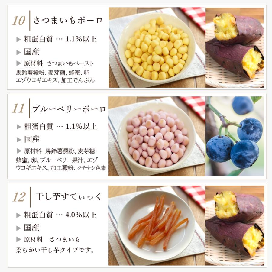 | さつまいもボーロ | 原材料 さつまいもペースト、馬鈴薯澱粉、麦芽糖、蜂蜜、卵、エゾウコギエキス、加工でんぷん 成分 粗たんぱく質 … 1.1%以上 粗脂肪 … 0.5%以上 粗灰分 … 0.2%以下 粗繊維 … 0.8%以下 水分 … 3.0%以下 カロリー 220kcal/100g 内容量 90g |