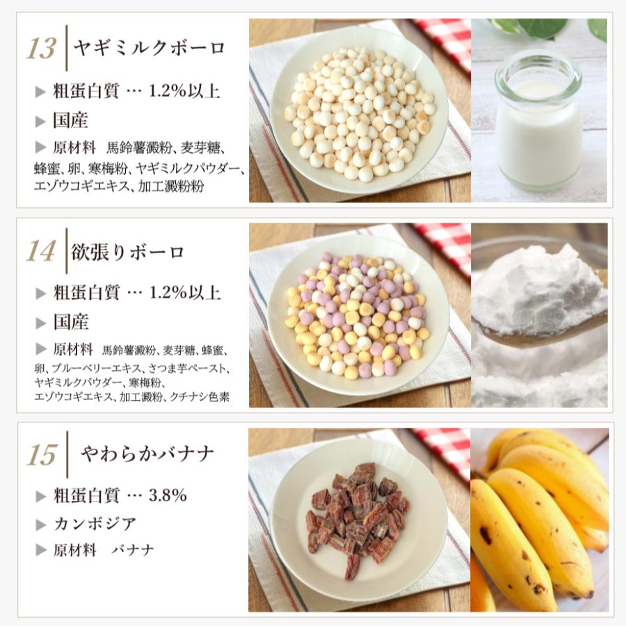 | ヤギミルクボーロ | 原材料 馬鈴薯澱粉、麦芽糖、蜂蜜、卵、寒梅粉、ヤギミルクパウダー、エゾウコギエキス、加工でんぷん粉 成分 粗たんぱく質 … 1.2%以上 粗脂肪 … 0.7%以上 粗灰分 … 0.3%以下 粗繊維 … 0.8%以下 水分 … 3.0%以下 カロリー 286kcal/100g 内容量 90g |