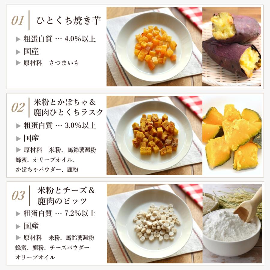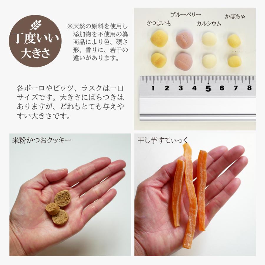【米粉かぼちゃ&鹿肉ラスク】【米粉とチーズ&鹿肉ビッツ】【さつまいもボーロ】【ブルーベリーボーロ】は蜂蜜が入っています。生後5か月未満のワンちゃんや超高齢のワンちゃんは、商品パッケージ記載の給与量などにご注意ください。また腎臓病、肝臓病と診断されている際は、獣医師へ確認を行っていただくことをお薦めします。
