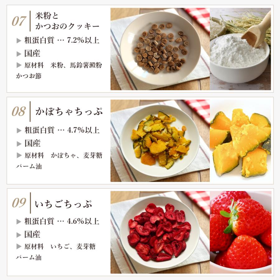 | 米粉とかつおのクッキー | 原材料 米粉、馬鈴薯澱粉、かつお節 成分 粗たんぱく質 …7.2%以上 粗脂肪 …2.5%以上 粗灰分 …0.8%以下 粗繊維 …0.8%以下 水分 …9.0%以下 カロリー 325kcal/100g 内容量 40g |
