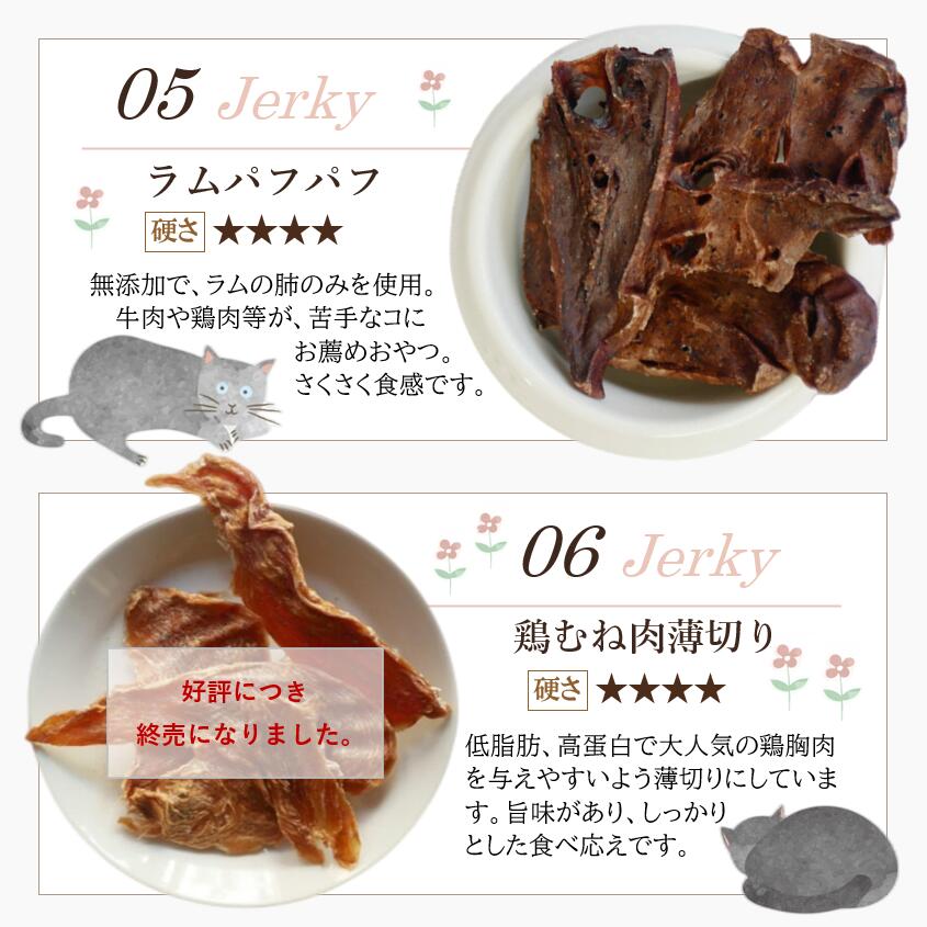 | 説明 | 猫ちゃんのご要望に合わせて、薄いもの、小さく加工したもの、ボリューム満点のものなど、バリエーション豊かにラインナップ。猫ちゃんのお好みに合わせて、お好きな4種を選んでください。チャック付きのパックに入れてお届けしますので、残してもキチンと封ができて便利♪ |